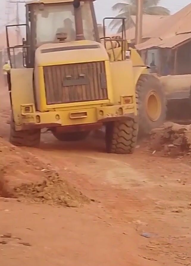 yellow CAT bulldozer working on a dirt road in what appears to be a village