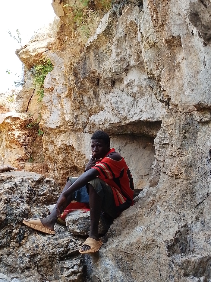 A dark-skinned young man wearing a red and black striped shirt, dark shorts, and sandals sits in a rocky landscape. He has a cigarette in his mouth. The background is composed of light-colored, layered rock formations with some sparse vegetation. The man is positioned near a small cave or indentation in the rock face, suggesting a sheltered spot. The overall scene conveys a sense of solitude and a rugged, natural environment.