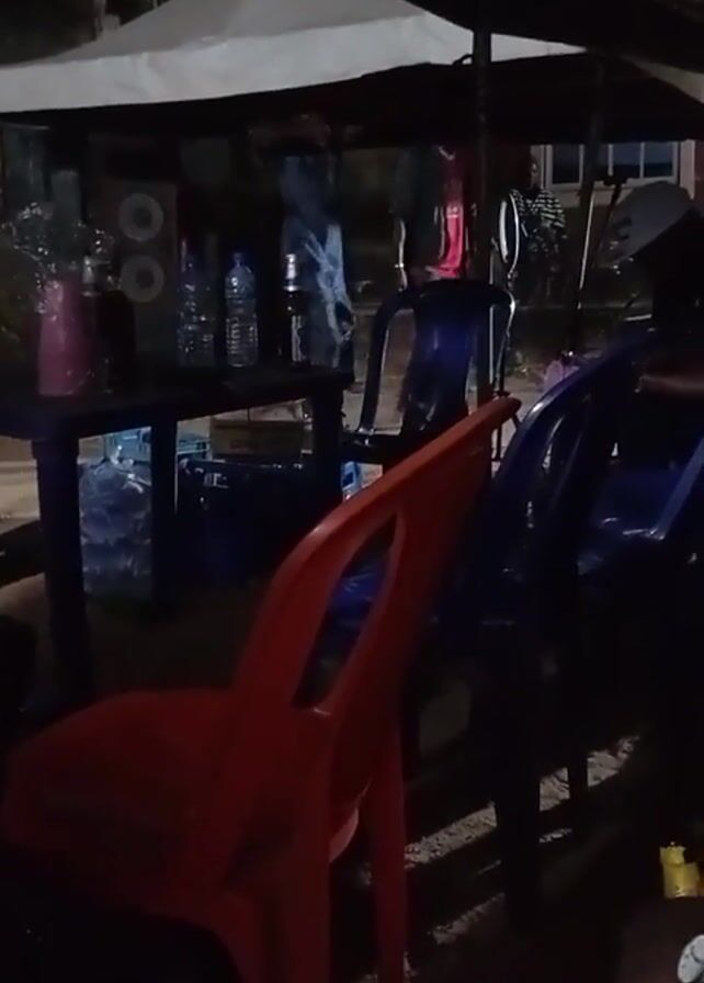 n outdoor gathering at night, under a white canopy. There is a dark table with water bottles and a beer bottle on it, next to a box. Several plastic chairs, in orange and blue, are arranged in front of the table. People are walking and standing behind the table, illuminated by the light. One person is wearing a red shirt. The area is dimly lit and the focus is on the activity under the canopy. Music is playing in the background.