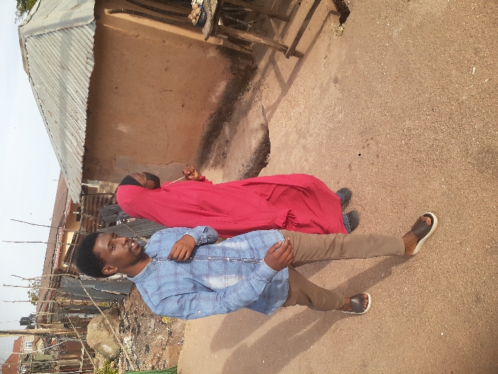 The image captures a daytime scene on an unpaved or dirt path in a residential area of Jos, Nigeria. In the foreground, a male individual with a medium-dark complexion and short dark hair is walking towards the viewer's left. He is wearing a light blue plaid long-sleeved button-up shirt, brown trousers, and dark slide sandals with white soles. His right hand is positioned near his chest, and his mouth is slightly open. Slightly behind and to his right, a second individual, female, is walking in the same direction. She is mostly covered by a red full-body garment and wears a black face mask, with only her eyes visible. To the immediate right of the individuals stands a small, single-story building constructed with mud or rammed earth walls and topped with a corrugated metal pyramidal roof. The base of the structure's walls shows dark staining. Adjacent to this building, on the far right, a simple wooden stand or stool displays several light-colored, round objects, likely produce. The background reveals additional residential structures, some utilizing corrugated metal as fencing or building material, and a larger, light-colored building with a dark roof is visible in the upper left background. The ground is a light brown, dusty, unpaved surface, and the sky overhead is bright and clear.