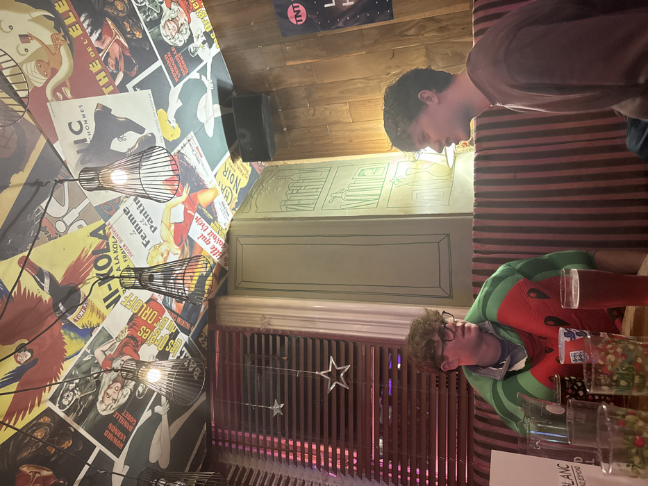 The image depicts the interior of La Petite France, a bar/restaurant located on Leazes Park Road in Newcastle upon Tyne, United Kingdom. The scene features two young adult males seated on a dark red bench with lighter red horizontal stripes, at a wooden table in the foreground. The male on the left has light brown, curly hair, wears dark-rimmed glasses, and is dressed in a padded green and red costume resembling a watermelon slice over a blue shirt. He is looking towards the right, seemingly engaging with the second male. The male on the right has dark, curly hair and wears a maroon long-sleeved shirt; his mouth is slightly open, indicating he is speaking or has just spoken to the male on the left. On the table, a clear glass pitcher of water is central. Various drinking glasses are present: a tall glass with a pinkish-red beverage (likely a beer or cider) is in front of the male on the left, alongside other glasses containing different beverages, one appearing to have an England flag emblem. A partial white sign with text "BLANC" and "RED" is visible behind the pitcher. The establishment's ceiling and upper wall sections are extensively covered with a collage of vintage French advertising and movie posters, primarily in yellow, red, black, and white tones. Three black, wire-frame pendant light fixtures with exposed bulbs illuminate the space. The left side of the frame shows dark red horizontal blinds with two silver star-shaped decorations hanging from them. Adjacent to the blinds, a white architectural trim borders a light green panel featuring stylized line drawings resembling hieroglyphics. The wall on the far right is paneled with light brown wood, and a black speaker is mounted high. A partially visible blue banner displaying "TNT" and the word "LIVE" hangs on this wooden wall.