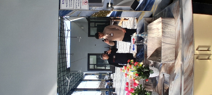 reflection of two men in a mirror. One is wearing a black top and a baseball cap, and the other is in a light-colored top. They are both looking at the camera and seem to be taking a selfie. In front of them is a floral arrangement with a sign. The background includes an outdoor area with vehicles and a building with windows and overhead fans. The reflection also shows a desk, a patterned wall, and light yellow cabinets.