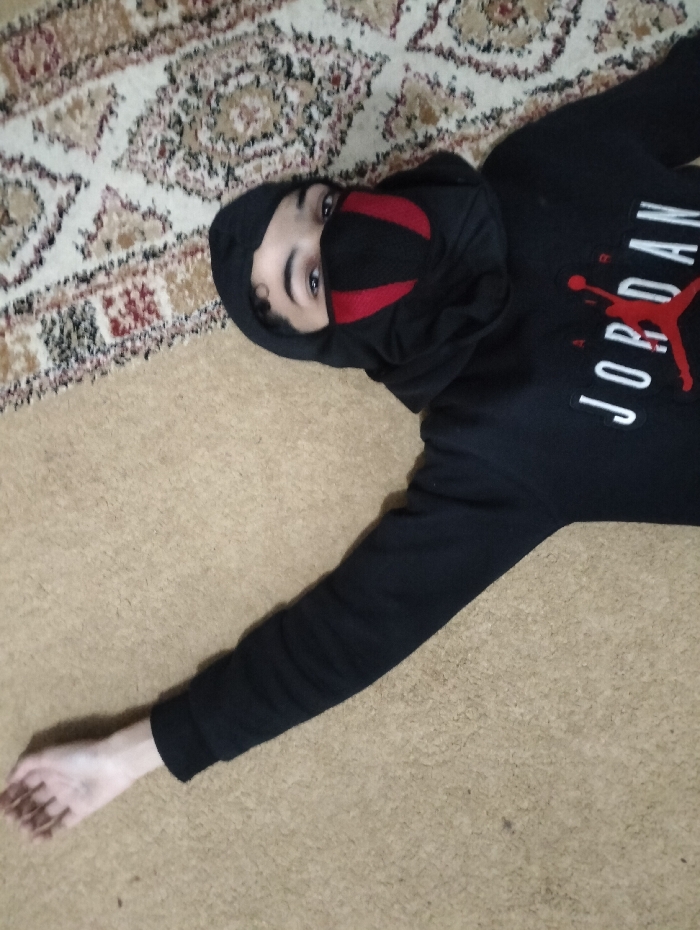 - "A person wearing a black Jordan hoodie and a black face covering with red accents is lying on a tan carpet" by FM-mEJUy2, licensed under CC BY 4.0