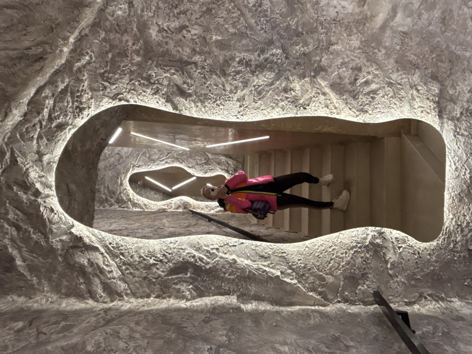 A single individual is depicted taking a selfie on a descending staircase within an architecturally designed, cave-like interior in Ulcinj - Ulqin, Montenegro
