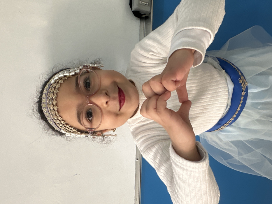A young female subject, appearing to be a child, is centered in a medium-shot photograph taken indoors in Salé, Morocco. She has dark, curly hair and is wearing pink-rimmed eyeglasses, a multi-layered headband with white and gold embellishments, and small gold-colored hoop earrings. Her lips are covered with dark red lipstick. She wears a white, ribbed long-sleeved top and a light blue layered tulle skirt with a blue and gold decorative belt or sash around her waist. Her hands are positioned in front of her chest, forming a heart shape with her fingers and thumbs touching. The subject is smiling directly at the camera. The background consists of a plain white wall above a horizontal blue panel or surface. A small, silver-toned object is partially visible on the right side of the blue surface.