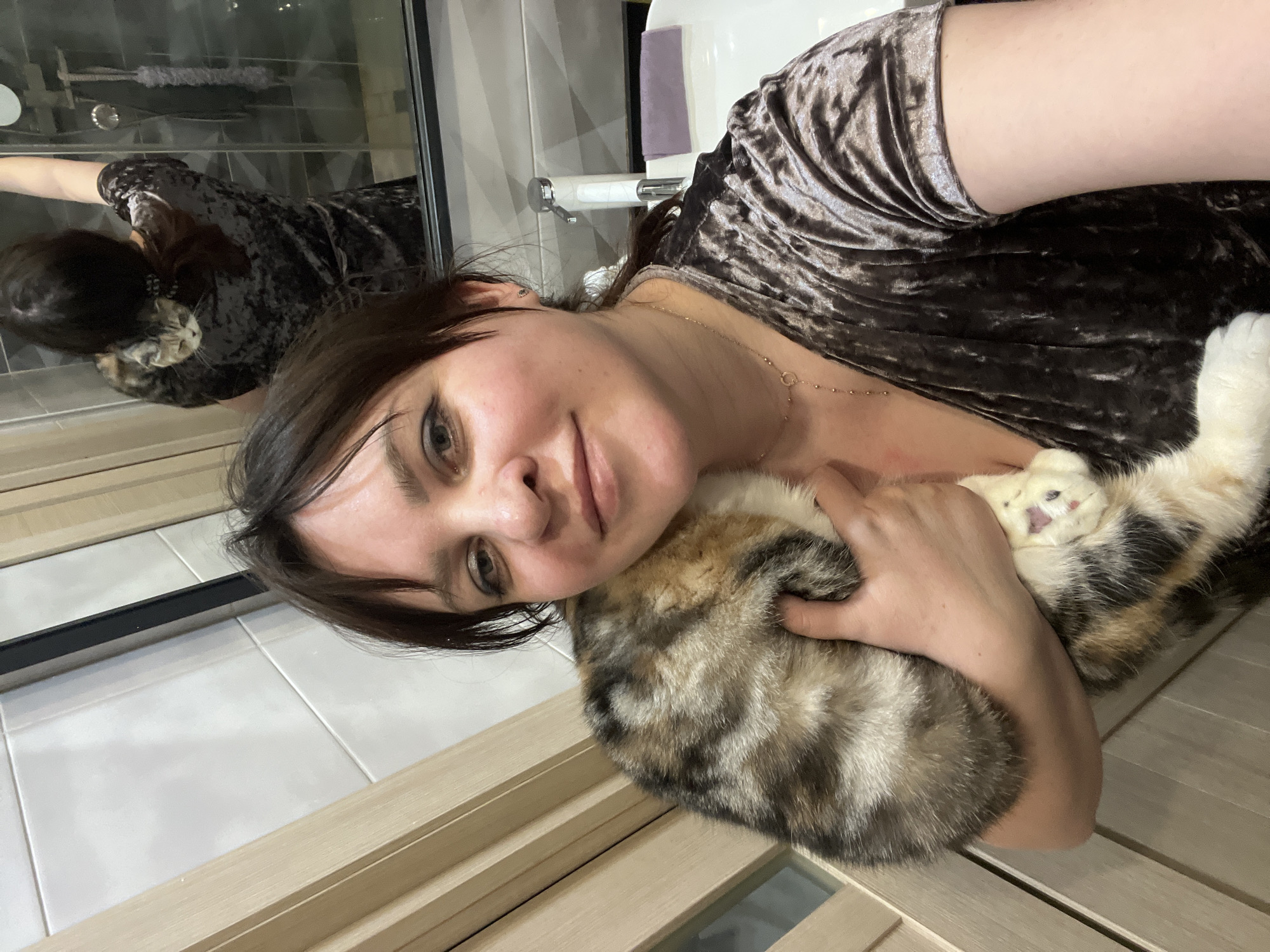 A woman in a brown velvet-like top is holding a calico cat. The photo appears to be taken indoors, possibly in a bathroom, as there is a mirror, sink, and tiled walls visible. The woman is looking at the camera with a slight smile. A reflection in the mirror shows the woman and cat from a different angle. The floor and door appear to be light wood. There is no information in the image to confirm that the photo was taken in the city of Noviy, Russia.