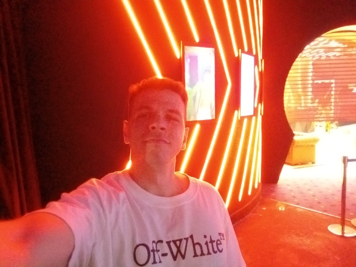 A male subject is depicted in a selfie, positioned centrally in the foreground. He has short, light brown hair and wears a white t-shirt with "Off-White" printed on the chest. His right arm is extended into the lower-left portion of the frame, holding the camera. The setting is an interior space in the city of Sarandí, Argentina, characterized by intense red and orange ambient lighting. To the left, a dark curtain is visible. To the right, a curved wall features multiple vertical orange-yellow light strips arranged geometrically, along with two rectangular frames displaying indistinct images. An archway on the far right leads to an adjoining area with brighter illumination, a red patterned carpet, a low, rectangular, golden-colored object, and a metal stanchion. The floor in the foreground is uniformly red.