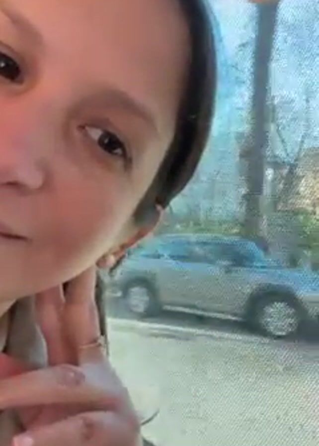 A woman is holding her phone up to her face, taking a video of herself from inside a vehicle. She is looking into the camera and briefly puts up a peace sign. Outside the window, one can see trees, houses, and parked vehicles. The day appears sunny.