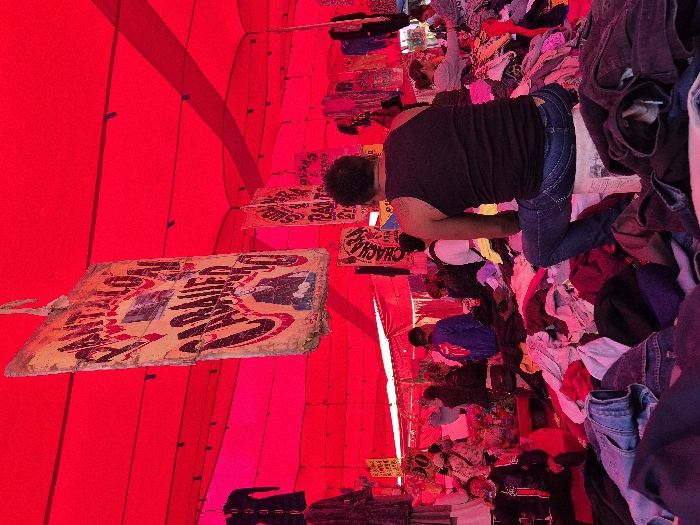 A woman is browsing through a pile of clothing at an outdoor market. The scene is brightly lit by a red tent overhead. Other people are visible in the background, also looking through the merchandise. Signs with Spanish text are visible in the scene. The clothing appears to be a mix of colors and styles.