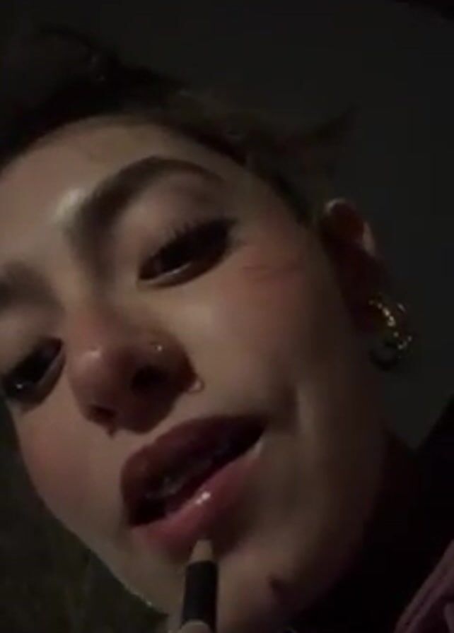 A close-up of a young woman with fair skin, wearing a pink hooded sweatshirt, using a dark lip pencil on her lips. She has brown eyes, a nose piercing, and large hoop earrings. Her hair is pulled back. Her teeth, visible because she has braces, are also covered with lip gloss. The background is dark, suggesting it is nighttime.