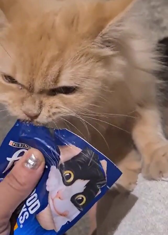 A person holds a blue packet of Purina Friskies cat treats, while a light orange cat tries to bite open the packet