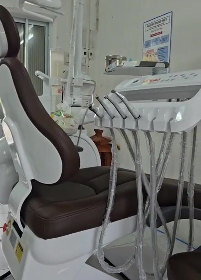 n empty dentist's office. A white and brown dental chair and tool station are centered in the frame. The tools hang in sterile plastic. A surgical mask hangs off the station. A small wooden cabinet holds cleaning supplies near a blue laundry basket. The walls are white and the room is well-lit.