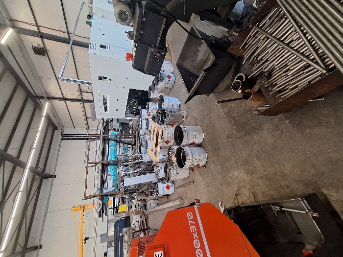 This image depicts an interior view of an industrial workshop or factory floor located in Simitli, Bulgaria. The environment features a high ceiling with exposed metal trusswork and overhead linear fluorescent lighting fixtures. The walls are constructed from light-colored panels, and the floor is unpolished concrete. No individuals are present in the scene. In the foreground left, a large, orange industrial machine, partially labeled "00X370," occupies the frame, with a wrench and a digital caliper resting on the concrete floor at its base. The central floor area is populated by approximately two dozen white metal buckets, many containing dark residues and displaying black-on-white hazardous material pictograms. To the background left, stacks of various metal materials, including sheets and bars, are stored on industrial shelving units beneath a yellow jib crane. The background right features a series of three large, white industrial processing machines, each equipped with control panels and yellow warning symbols. In the immediate foreground right, a dark rectangular industrial container is present, alongside a wooden crate filled with numerous cylindrical metal rods. Additional loose metal rods are scattered on the adjacent floor, and a dark-colored machine with an exposed motor is partially visible on the far right. A ventilation fan is affixed to the upper right wall.