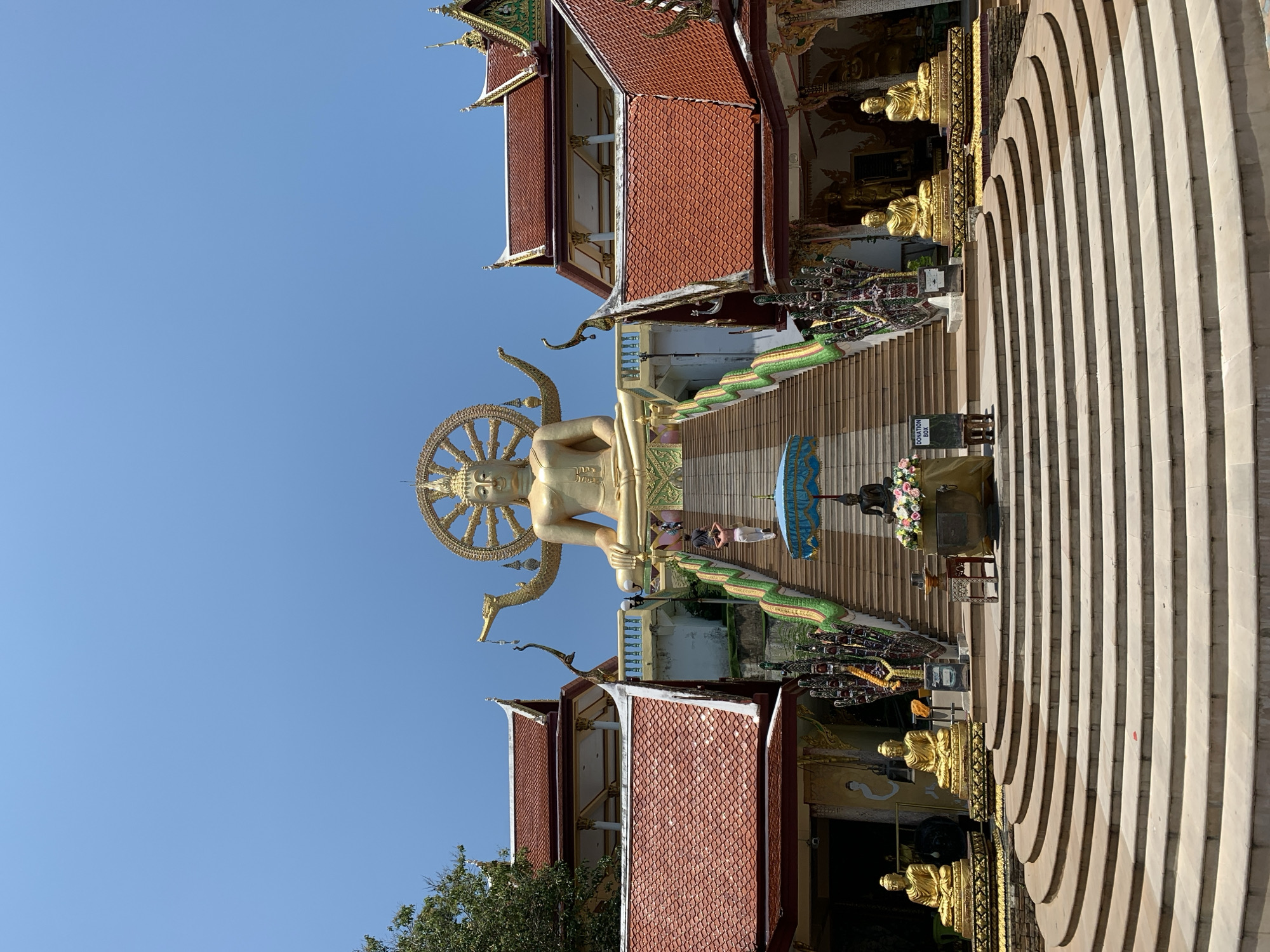 This image captures Wat Phra Yai, also known as the Big Buddha Temple, in Baan Plai Laem, Koh Samui, Thailand, under a clear blue sky. A colossal golden Buddha statue, depicted in a seated meditative posture with its right hand touching the earth (bhumisparsha mudra), is centrally positioned atop a multi-tiered elevated platform. Behind the Buddha's head, a large golden Dharmachakra (Dharma Wheel) is prominently displayed, flanked by two golden Naga serpents whose heads rise from behind the statue's shoulders. A broad, multi-level stone staircase, composed of numerous steps, leads directly up to the base of the Buddha statue. The railings flanking the main ascent of the stairs are intricately sculpted as multi-headed Nagas, adorned with green, red, and yellow scales. Two individuals are observed ascending the stairs; one person in a white shirt and light-colored pants is approximately halfway up, while another is visible further towards the top. At the base of the staircase, a smaller, dark-colored seated Buddha statue rests beneath a blue parasol. Adjacent to it, a golden fabric-draped stand holds a floral arrangement. To the left of the main stairs, two smaller golden seated Buddha statues are elevated on decorated platforms. A "Donation Box" sign on a stand is also visible at the lower landing. Two traditional Thai temple buildings flank the central staircase and the elevated Buddha platform. These structures feature distinctive multi-tiered red-tiled roofs with white trim and intricate golden gables and ornamentation. Green foliage from a tree is visible on the left side of the frame, partially obscuring the left temple building. The entire scene is well-lit by natural sunlight.