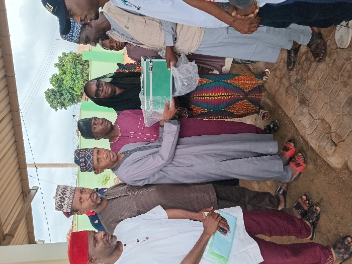 This image captures an outdoor scene in Rigachikun, Nigeria, beneath a corrugated metal roof structure. The foreground features a mix of unpaved earth and a section of geometrically patterned concrete paving. Ten individuals, primarily adult males and two adult females, are present. The central focus is on two adult males jointly holding a new, green, rectangular metal case, which is partially wrapped in clear plastic. The man on the left, wearing a light grey long tunic and a dark patterned cap, holds the left side of the case. The man on the right, dressed in a light tan vest over a light grey long tunic and a dark baseball cap, holds the right side. This interaction suggests a formal handover or presentation. To the far left, an adult male in a white long-sleeved shirt, red fez cap, and dark maroon trousers holds light blue documents. Other individuals observe the central exchange: an adult male in a brown tunic and patterned cap is positioned to the left of the central figures. To the right, an adult female in a black hijab and patterned dress, and an adult male in a dark maroon shirt and black cap, are visible. The background consists of a light green painted wall and distant trees under an overcast sky.