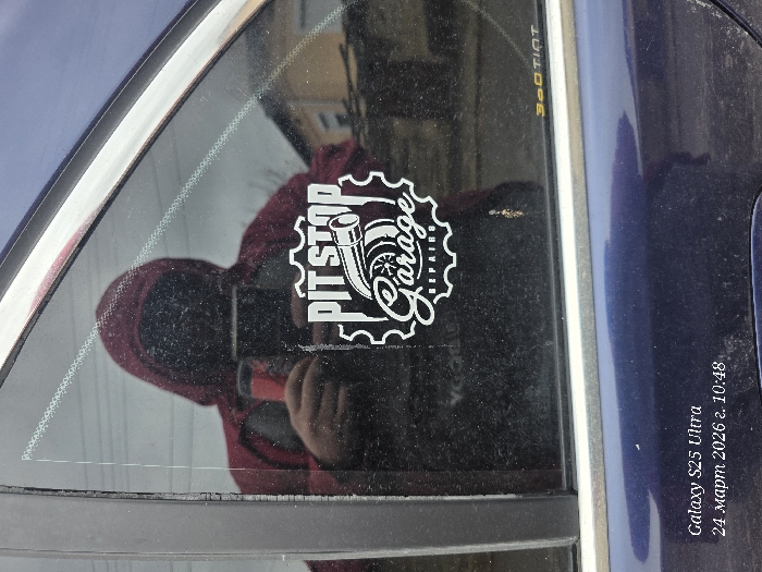The image displays a close-up, angled view of the rear passenger door and window of a dark blue vehicle, located in Dolna Beshovitsa, Bulgaria. A white vinyl sticker, featuring a gear outline, is affixed to the exterior of the window. The sticker design incorporates the text "PIT STOP" above a turbocharger illustration, with "Garage REPAIRS" positioned beneath it. The window glass is visibly dirty, covered in dust and specks. A faint "3M TINT" logo is present in the lower right corner of the window. A person, wearing a dark red or maroon hooded sweatshirt, is reflected in the car window. This individual is holding a dark-colored smartphone in their right hand, aimed toward the window, and a separate object with a red handle in their left hand. Their face is obscured by the reflection. Through the window's reflection, an outdoor background is discernible, including a portion of a light-colored building and dark, bare vegetation under an overcast sky. The image was recorded by a Galaxy S25 Ultra on March 24, 2026, at 10:48.