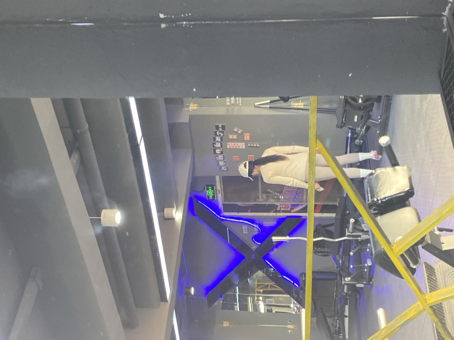 In a gym setting, a person with long hair wearing a white cap, long sleeve shirt, and pants is seated on a piece of equipment. Behind them is a wall adorned with signs and an X-shaped structure illuminated with blue lights. The scene includes various gym machines and lighting fixtures on the ceiling, creating an atmosphere conducive to exercise.