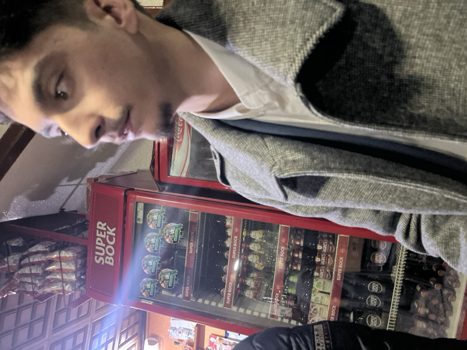 A person in a gray tweed-like jacket and white shirt poses near a red vending machine filled with "Super Bock" beer and "Sagres" beer. The machine also has a Coca-Cola logo on its side. A shelf containing snacks is visible near the bottom of the frame. The overall composition is slightly rotated, presenting a tilted perspective of the scene.