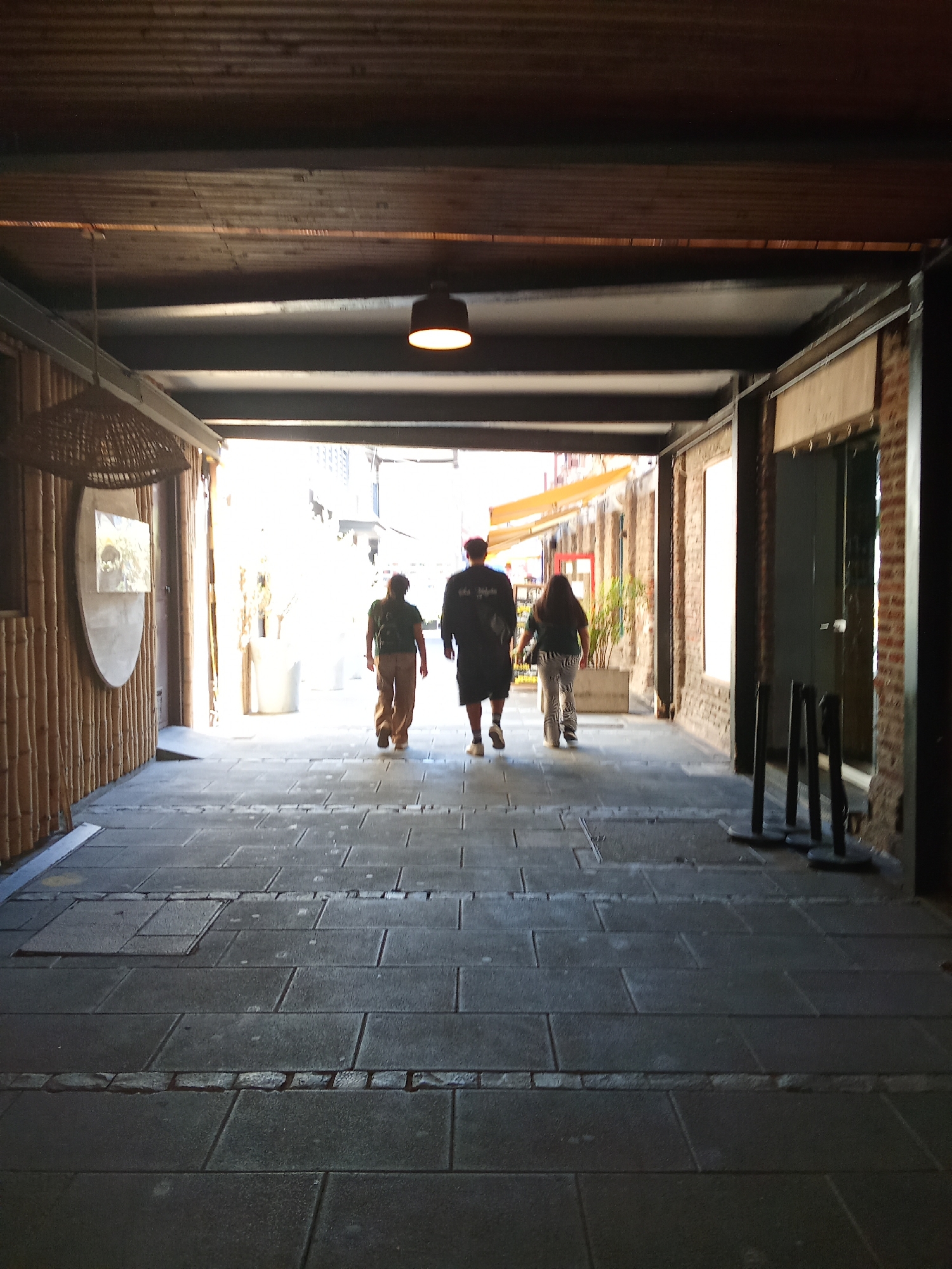 Three individuals are walking away from the viewer through a covered walkway. The walkway has a wooden roof supported by dark metal beams. A single light fixture hangs from the roof. On the left side, there is a structure with bamboo-like siding and an oval sign. On the right, there is a brick wall. The floor is paved with rectangular stone blocks. The background is brightly lit, indicating the end of the walkway leads to an open area. This could be the walkway in the city of Providencia, Chile.