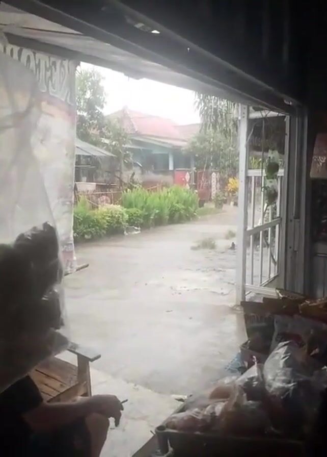 view from inside a shop looking out onto a rainy street. A person is sitting in the shop, smoking a cigarette. The shop is cluttered with various items. Outside, there is a house with a red roof and a garden. The street is wet and there is visible rain. The sound of rain and wind is audible.