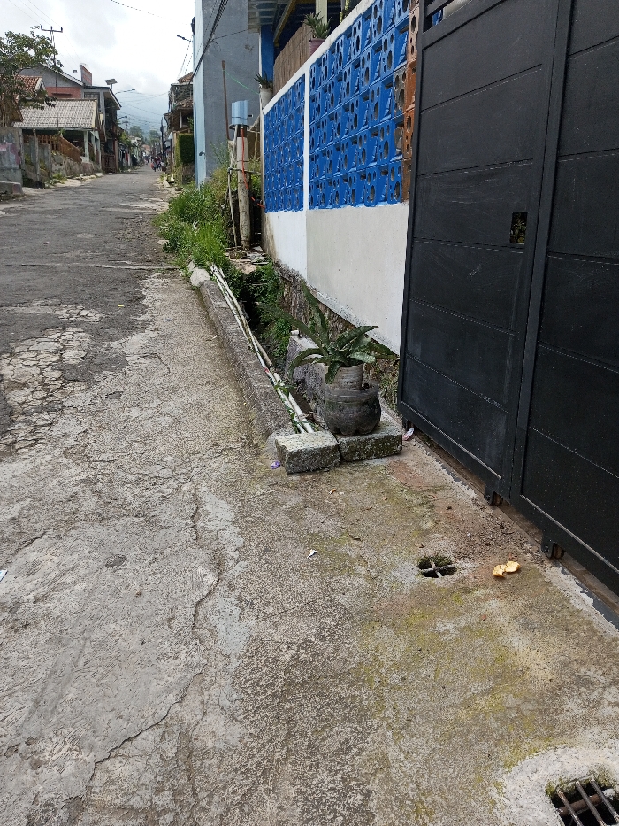 The image depicts a residential street scene in Viengthong, Laos, under an overcast sky. The foreground on the right features a black, ribbed metal sliding gate. Adjacent to the gate, a dark, cylindrical planter containing a green leafy plant rests on two stacked square concrete blocks on the cracked concrete pavement. The pavement exhibits areas of green moss or algae growth and contains a small, square open drain and a discarded yellow object. A metal-grated drain is visible at the bottom right. A narrow concrete curb runs parallel to the street on the left, bordering a vegetated drainage ditch containing white pipes. Behind this ditch, a wall consists of a white lower section topped with blue-painted, openwork concrete breeze blocks. A utility pole and a structure with a water tank are visible behind the wall. The main street, paved with cracked asphalt or concrete, recedes uphill, flanked by various residential buildings of diverse construction. Overhead utility lines are present. Distant hills or mountains are visible in the background. No discernible individuals are present in the immediate scene.