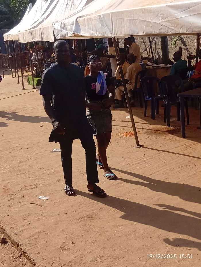 An outdoor scene in Isinyi-Nando, Nigeria, depicts a gathering under white canopy tents on a clear, sunny day
