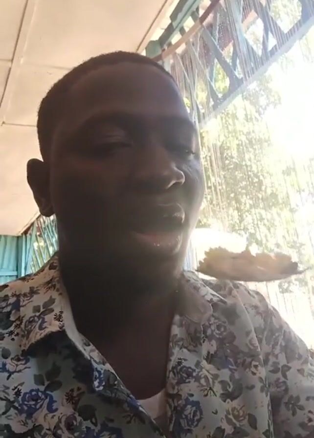 A dark-skinned man wearing a white and blue flowered button-down shirt is recording a selfie video. He is eating something from a spoon. He is indoors under a white ceiling and in front of a window. The background outside the window is bright and blurry with some visible greenery. The man looks directly into the camera. There is noise in the background.