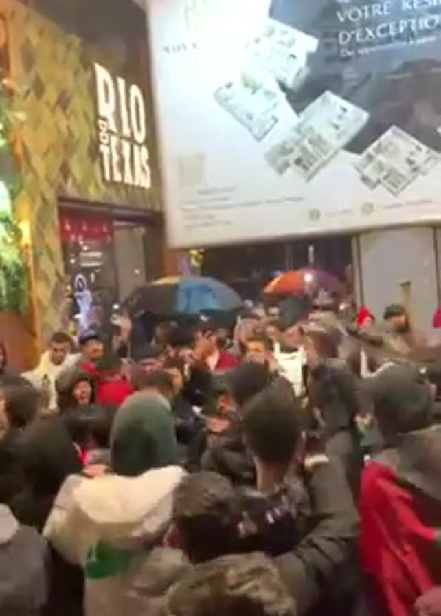 dense crowd of people gathered on a street, apparently celebrating. Most individuals are young men dressed in casual winter clothing, including hoodies and jackets. Some are holding up smartphones, presumably to record the event. There's a red and green vuvuzela visible within the crowd. The environment is a street scene, illuminated by streetlights and shop signs. The "RIO DOS TEXAS" sign is visible on a building, and a large billboard promoting "NOVA HILLS" is in the background. The overall atmosphere is festive and animated.
