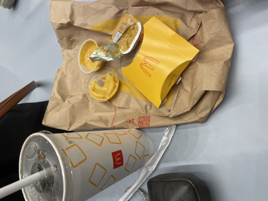 - "A close-up, elevated view depicts fast food items from McDonald's resting on a light grey, smooth surface, consistent with a table, within an airport in Israel" by FM-AyUtz1, licensed under CC BY 4.0