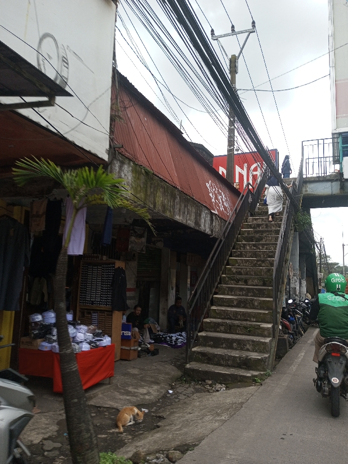 The scene depicts an urban street in Gubbisamamidi, India, under an overcast sky. On the left, an open-front shop exhibits clothing and a table with multiple white skullcaps for sale, positioned in front of a small palm tree. Inside the shop's entrance, two men are seated on the ground. An orange cat lies on the concrete ground near the shop entrance. In the center, a concrete staircase with dark metal handrails ascends to a pedestrian overpass. A person in light-colored attire is ascending these stairs, while another person in dark clothing is visible on the overpass. Adjacent to the stairs, a building features a reddish corrugated metal roof and a partially visible red sign with "DANA" in white lettering. Numerous electrical wires crisscross above the street, originating from a utility pole. On the right, a person wearing a green "Grab" helmet and vest drives a dark motorcycle away from the viewer on the paved street. Multiple other motorcycles are parked along the curb.