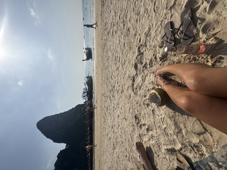This image depicts a sunny beach scene in Ban Ao Nang, Thailand. In the immediate foreground, a person's tanned bare legs extend onto the light brown sand; a pink string bracelet is visible on the right ankle. To the left, a portion of another person's bare feet is visible. A green coconut drink with a white straw rests on the sand between the feet. To the right of the legs, a pink bottle labeled "SMIRNOFF ICE" stands upright in the sand, next to a pair of dark-colored flip-flops. The midground features a wide sandy beach descending to the ocean. Several individuals are visible: two figures are on the beach in the left-center area, while a third person walks along the waterline on the far right. Numerous traditional dark longtail boats are beached or anchored along the shore and in the water, concentrated on the left side. The water's surface reflects bright sunlight. The background is characterized by a prominent, dark limestone karst mountain on the left, partially covered in green foliage at its base. Smaller, distant islands or rock formations are visible on the horizon towards the right. The sky is bright blue with a strong sun flare in the upper center, indicating clear weather.