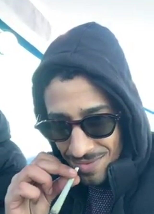 A close-up video shows a man with a mustache and sunglasses smoking a cigarette. He is wearing a dark hooded jacket and a patterned shirt. Another man in a black jacket and glasses is partially visible in the background, smiling. The scene appears to be inside a boat or vehicle, with a white ceiling visible above.