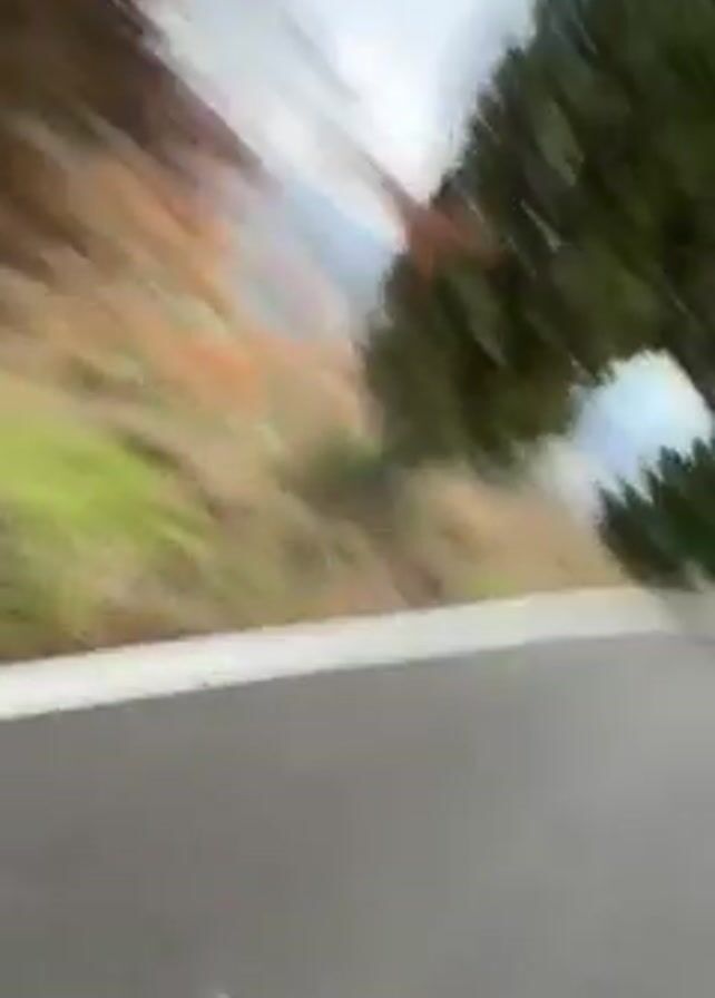 A person with brown hair wearing a green sweatshirt runs down a winding asphalt road. The road has white lines on the side and is lined with tall, thin trees on one side and a sloped hill with shrubs on the other. The sky is overcast and pale. The person is running away from the camera. The perspective shifts and continues down the road with the camera, but the runner disappears.