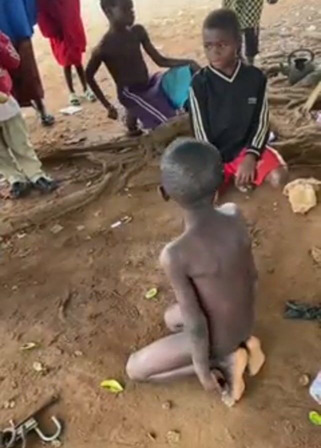 group of children in an outdoor setting, possibly a village or rural area, with a dirt ground and tree roots visible. One boy is kneeling with his hands seemingly tied behind his back. Other children are standing or sitting around him, some looking at him. The children are wearing various clothing items. A metal object that looks like a lock or shackle is lying on the ground nearby. The overall atmosphere is unclear, but the kneeling boy's situation suggests a possible disciplinary action or a staged scene.