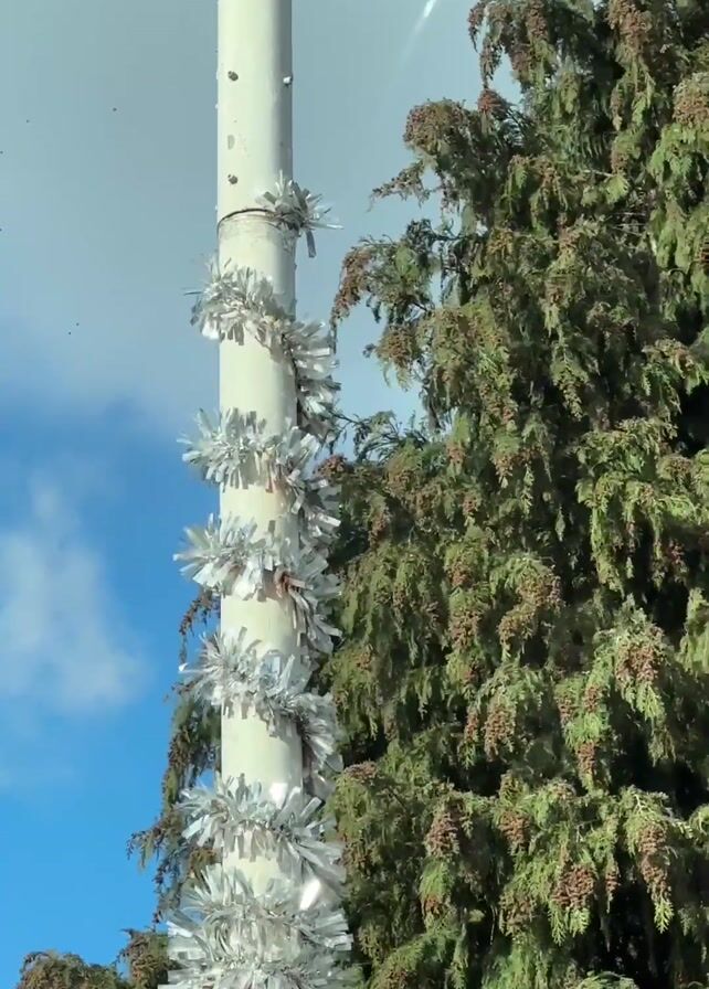 tall, white pole decorated with shiny, silver tinsel-like ornaments. The pole is positioned next to a large green tree. The sky is visible in the background, with a few white clouds. The video appears to be taken from a moving vehicle.