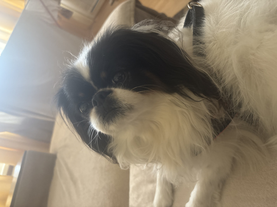 - "The scene, located indoors in Sofia, Bulgaria, features a small domestic dog, identifiable as a Japanese Chin or similar toy breed, lying on a light-colored upholstered surface, likely a sofa or bed" by FM-W0JCt1, licensed under CC BY 4.0