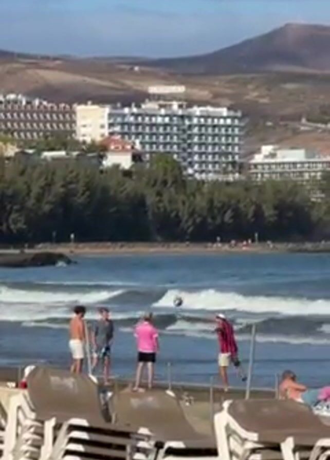 The scene shows four young men playing with a ball on a sandy beach, with rows of stacked deck chairs in the foreground
