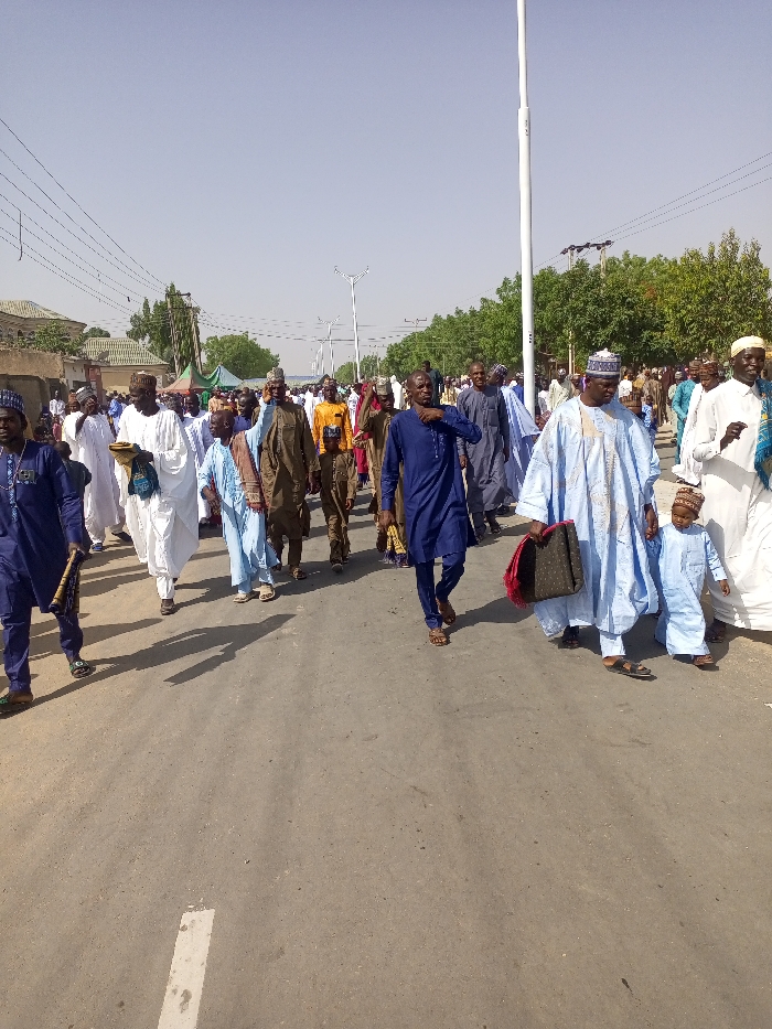 group of men walking down a paved street in Maiduguri, Nigeria. The coordinates provided indicate a location within the city. The men are all dressed in traditional clothing, with some wearing white robes and others wearing blue or brown clothing. They are walking in a single file line, and some are carrying bags or other items. The street is lined with trees on both sides, and there are a few buildings in the background. The sky is clear and the sun is shining. The scene appears to be a street during a large gathering or festival. The men are walking in the same direction. The scene is taken from a slightly elevated perspective. The men are all walking towards the camera, and the image has a slight sense of motion blur. There are no women or children visible in the image.