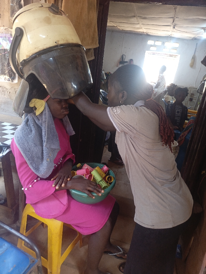 Inside a beauty salon, a woman in a pink dress sits on a yellow stool with a towel over her head, under a hooded hair dryer. She holds a green bowl filled with colorful hair curlers. Standing next to her, another woman in a tan shirt and black pants adjusts the dryer. A mirror reflects the scene, showing a glimpse of other people in the background. The salon appears simple, with daylight streaming through a window.