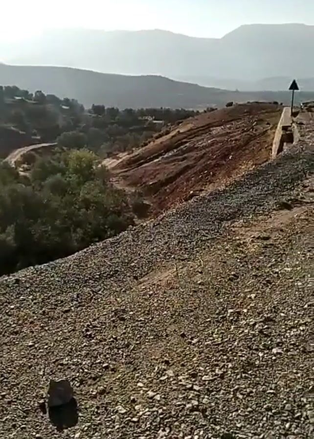 mountain road in a rural area. The camera pans up from a gravelly slope to a paved road with a triangular road sign. In the distance, mountains can be seen through a hazy atmosphere. A car drives along the road towards the camera's position. The surrounding landscape features green trees and red-brown soil.