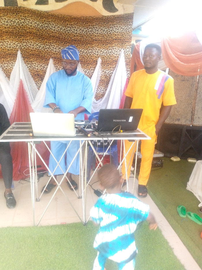 Two men stand behind a table with laptops and audio equipment. The man on the left wears a light blue outfit and a striped cap, while the man on the right wears orange clothing. A child in a blue and white tie-dye outfit is in the foreground. Behind them are decorations: white and red fabric draped in front of a leopard print backdrop. Artificial grass covers the floor in the foreground.