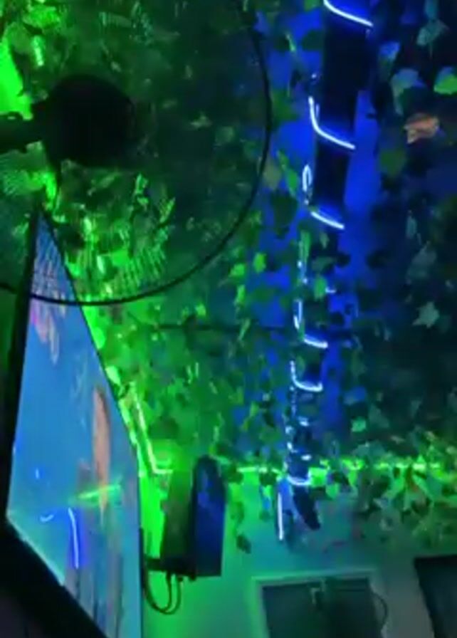 A room interior is shown with a ceiling decorated with artificial greenery and illuminated by red and blue neon lights