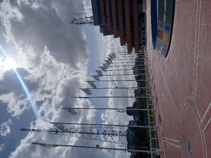 A slightly angled view of a brick-paved plaza with concentric circle designs. A building with a copper-colored facade stands at the top of the frame. A row of flagpoles with diverse flags leads towards the sky, filled with scattered clouds and a bright sun. Visible behind the flags is a cityscape. A black tower is also visible among the flagpoles.