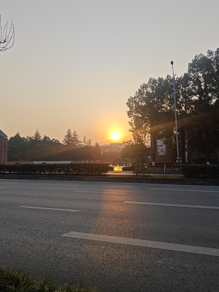 The scene depicts an outdoor environment in the Chongqing High-tech Zone, China, during either sunrise or sunset. A multi-lane asphalt road occupies the lower foreground, featuring solid and dashed white lane markings. The road surface exhibits a warm orange reflection from the sun. A low-lying, bright orange sun is prominently visible in the upper-middle-right, casting intense light across the horizon. Separating the road from the background elements is a manicured green hedgerow. Behind this hedgerow, a body of water reflects the sun's light as a bright orange horizontal band. A dark, decorative bridge with multiple railings spans this water body. The background consists of dense tree lines, comprising both conifers and broadleaf trees. A section of a red-brick building is partially visible on the far left. On the right side, a tall, slender streetlamp pole stands, with a partially obscured white rectangular sign located beneath a dense canopy of trees. No individuals or specific activities are observable within the frame.