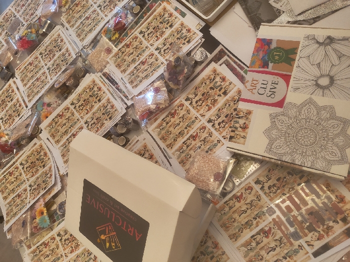 The scene in Benkovski, Bulgaria, depicts a flat surface, likely a table, densely covered with various art and craft supplies. Numerous sheets of paper, each displaying multiple small, vintage-style illustrations arranged in rows and columns, are spread across the area. Interspersed among these papers are multiple clear plastic bags containing small craft components, including colorful artificial flowers, assorted beads (such as gold/bronze and reddish hues), and small metallic objects, possibly charms or fasteners. A white cardboard box, open or partially open, is prominent in the foreground, featuring a black label with "ARTCLUSIVE Creative Art & Craft Box" and a stylized logo. In the lower right quadrant, another open white box reveals contents consistent with a craft kit: sheets with intricate mandala and floral (daisy) line art designs, a red banner-like element marked "ART CLUSIVE :", and a green ribbon with "#1" printed on it. No individuals or active interactions are visible in the image.