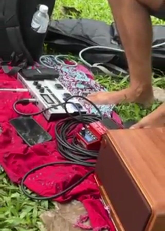 A medium shot shows a musician sitting on a small, black chair in a park while playing a guitar. He is barefoot, wearing shorts and a floral shirt. In front of him, on a red blanket spread on the grass, are various pieces of equipment including a white guitar effects unit, a red pedal, a smartphone, and black cables. A wooden speaker sits to his right, and a black backpack is behind him. The park has a fair with tents and people in the background, under a clear sky with visible trees. The camera gradually zooms out to reveal more of the surrounding park.