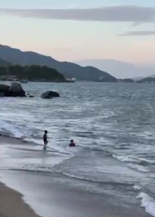 Two children are playing on a beach. One child is standing near the shoreline, while the other is wading in the water as waves roll in. The beach has a gentle slope, and there are a few large rocks visible in the distance along the shoreline. Behind the beach is an island with green vegetation, and even further in the background are mountains. The sky is light with a few clouds.