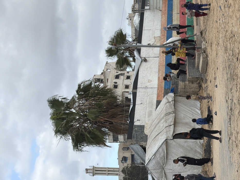 The image depicts an outdoor scene in the city of Gaza, Palestinian Territory, under an overcast sky. In the foreground, the ground is sandy and uneven, with scattered debris. On the left, a large, rectangular tent constructed from white canvas or tarp stands with its entrance facing right. An adult male wearing a dark tracksuit with white stripes is standing near the tent, facing towards the right. Several other individuals, mostly children and younger males in casual attire, are present on the sandy ground near the tent. One child in a black hoodie and pants stands with his back to the viewer, while another smaller child in a light-colored top stands further right. In the midground, a low concrete wall or structure runs horizontally, featuring horizontal painted stripes in shades of blue, orange, black, and white. Integrated steps lead up to the top of this structure. Approximately ten individuals, predominantly children, are either sitting or standing on these steps and the top of the wall. They are dressed in various casual clothing, including hoodies. A metal pole, possibly a street light, stands towards the right of this group. In the background, behind the wall and palm trees, multiple multi-story buildings are visible, exhibiting significant damage, including missing sections, exposed interiors, and visible structural compromises. A large palm tree with both green and browning fronds stands prominently in the center of the image, partially obscuring some of the damaged buildings. Another smaller palm tree is visible to its right. On the far left horizon, a tall, slender, light-colored minaret-like structure with small, dark openings or damage marks on its upper sections rises against the cloudy sky.