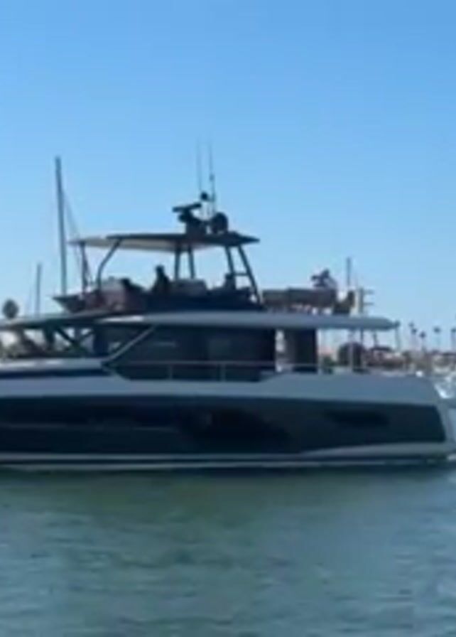 A two-story yacht with people on board moves through a body of water under a clear, blue sky. The yacht is white and dark gray with a black top. Other boats, palm trees, and houses are visible in the background. The water is choppy.