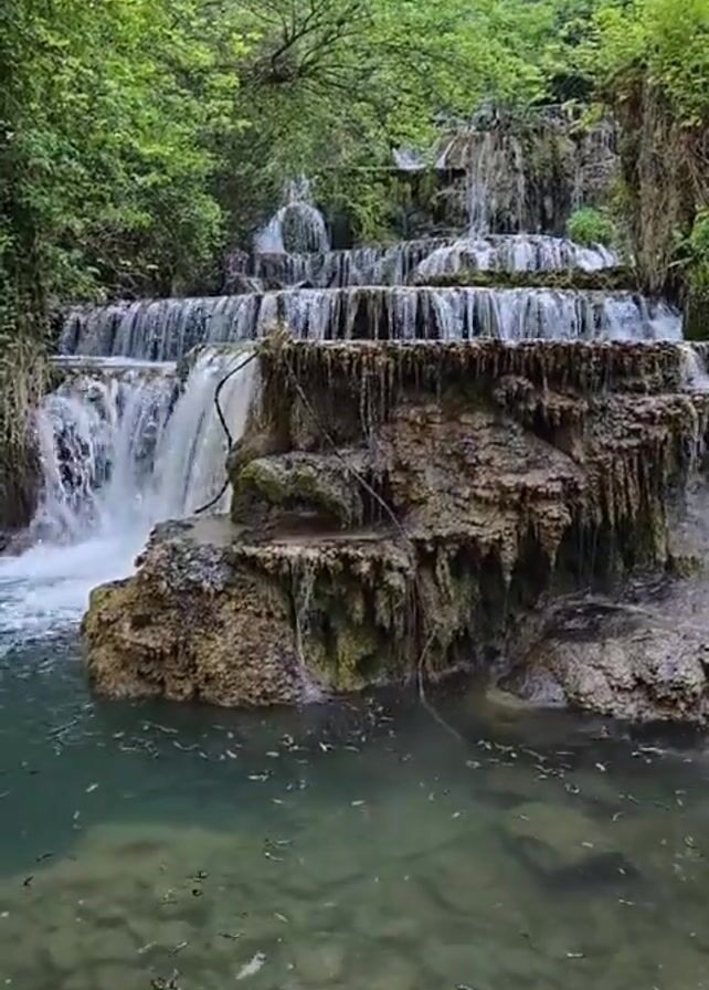 scenic view of a multi-tiered waterfall cascading into a clear, shallow pool. The waterfall is surrounded by lush green foliage and trees, creating a natural, serene environment. The water flows over several rocky ledges, creating small, individual waterfalls that merge as they descend. The pool at the bottom is clear enough to see the rocky bottom and some small dark shapes, possibly fish or debris. The overall lighting is soft and diffused, suggesting an overcast day.